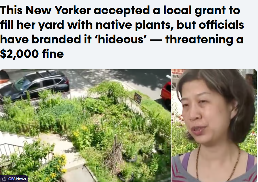 在美国纽约长岛的一个宁静小镇上,一家华人本着环保的初心,将自家前院的传统草坪改种为原生植物园,吸引了成群蜜蜂、蝴蝶和鸟类。但没想到,这一片“生机盎然”的庭院,竟成了市政口中的“丑陋不堪”,并引发高达2000美元的罚款威胁。她的环保善举,竟换来的是四次上庭与公众质疑。