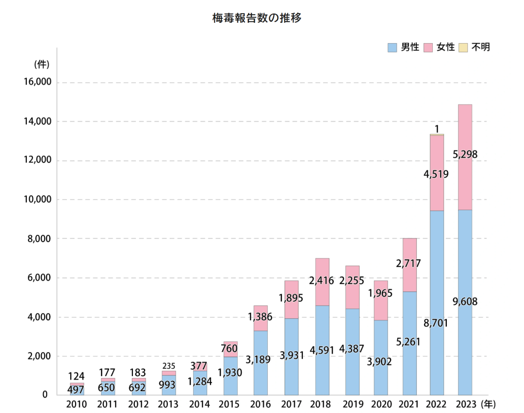 站街女带来的另一个非常大的社会隐患则是日本梅毒患者的大量增多。虽然自1993年后,日本国内梅毒病例持续减少,但自2010年左右开始悄然反弹。2024年全年,日本报告的梅毒患者为14663人,几乎与历史最高的2023年持平。