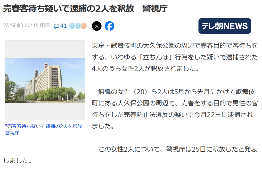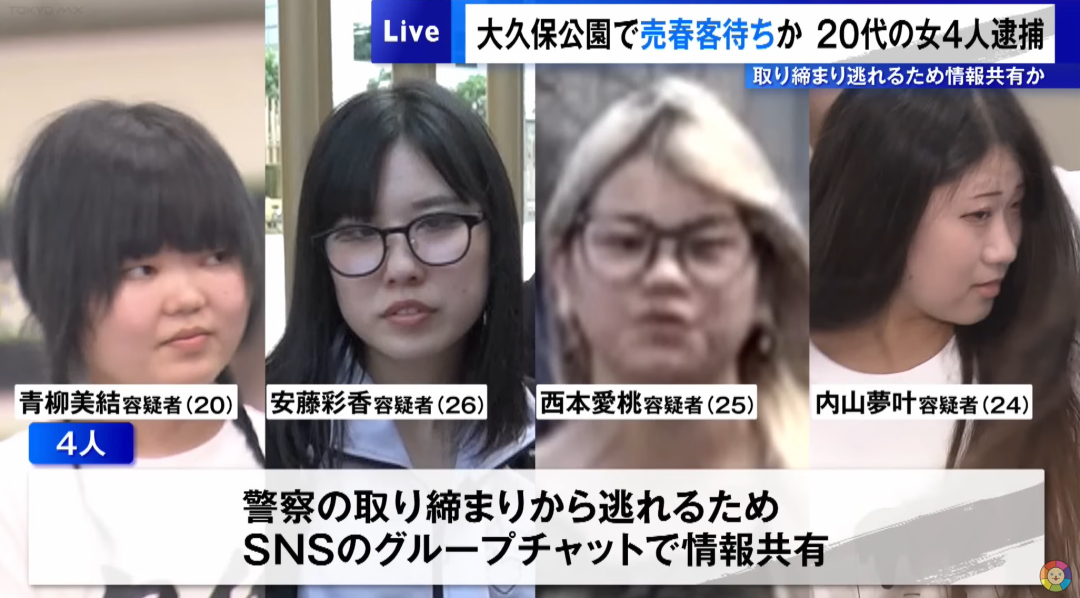 多家日本主流媒体报道,警视厅以涉嫌违反《卖春防止法》为由,在大久保公园周边地区逮捕了4名二十多岁的日本籍女性。