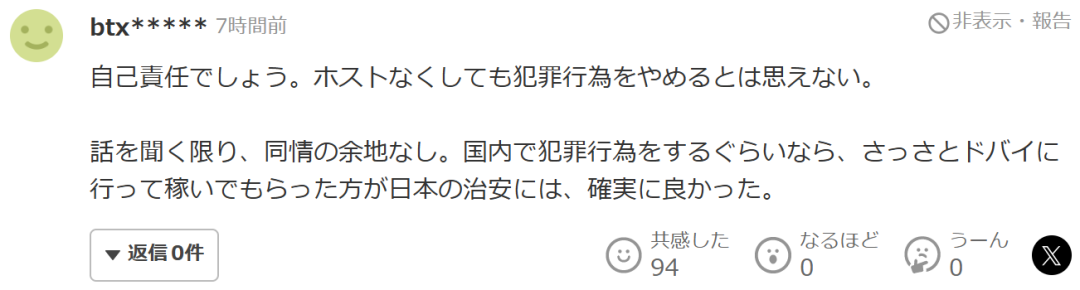 从听到的情况来看,毫无同情的余地。与其在国内进行犯罪活动,不如赶紧去迪拜赚钱,这对日本的治安无疑会更好。”