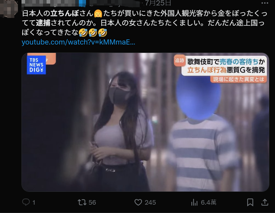 疫情过后,访日游客数量急剧增加。站街女又找到了新目标,专坑外国游客,使得案件性质更加敏感。