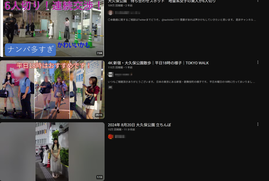 在一些海外平台上,搜索日语站街女(立ちんぼ)或者大久保公园的罗马字——「tachinbo」、「OKUBO PARK」等,可以看到大量相关视频映入眼帘。