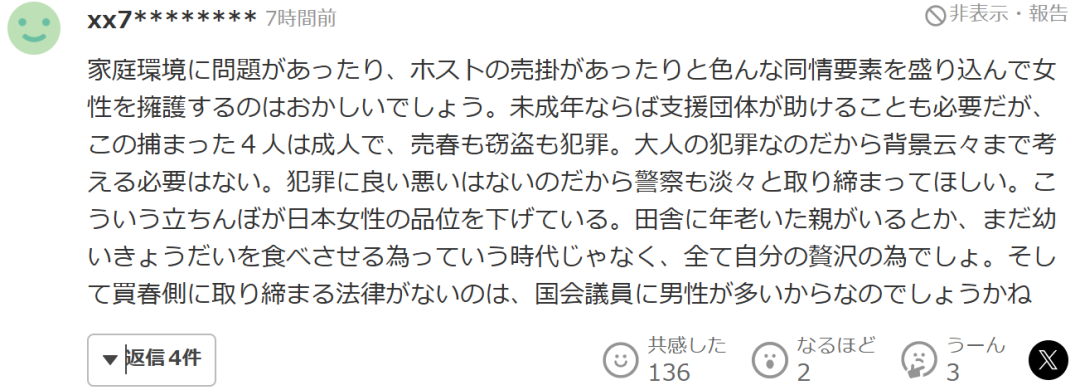 “有家庭环境问题、背负着牛郎欠款等各种同情因素来为女性辩护,这是不对的。如果是未成年人,支援团体提供帮助是必要的,但这次被捕的4人都是成年人,卖春和盗窃都是犯罪。既然是成年人犯罪,就没必要去考虑他们的背景之类的理由。犯罪没有好坏之分,警方应该淡然依法严肃取缔。这种站街行为正在降低日本女性的品格。现在不是为了乡下年迈的父母,也不是为了养活年幼的兄弟姐妹的时代了,全部都是为了自己的奢侈消费。而且针对买春方没有相应的法律处罚,是因为国会议员中男性居多吗?”