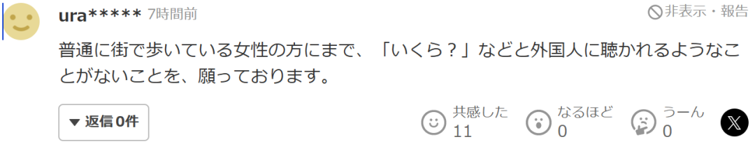 “真心希望普通在街上走的日本女性们,不会被外国人问到「多少钱?」这样尴尬又不尊重的问题。”