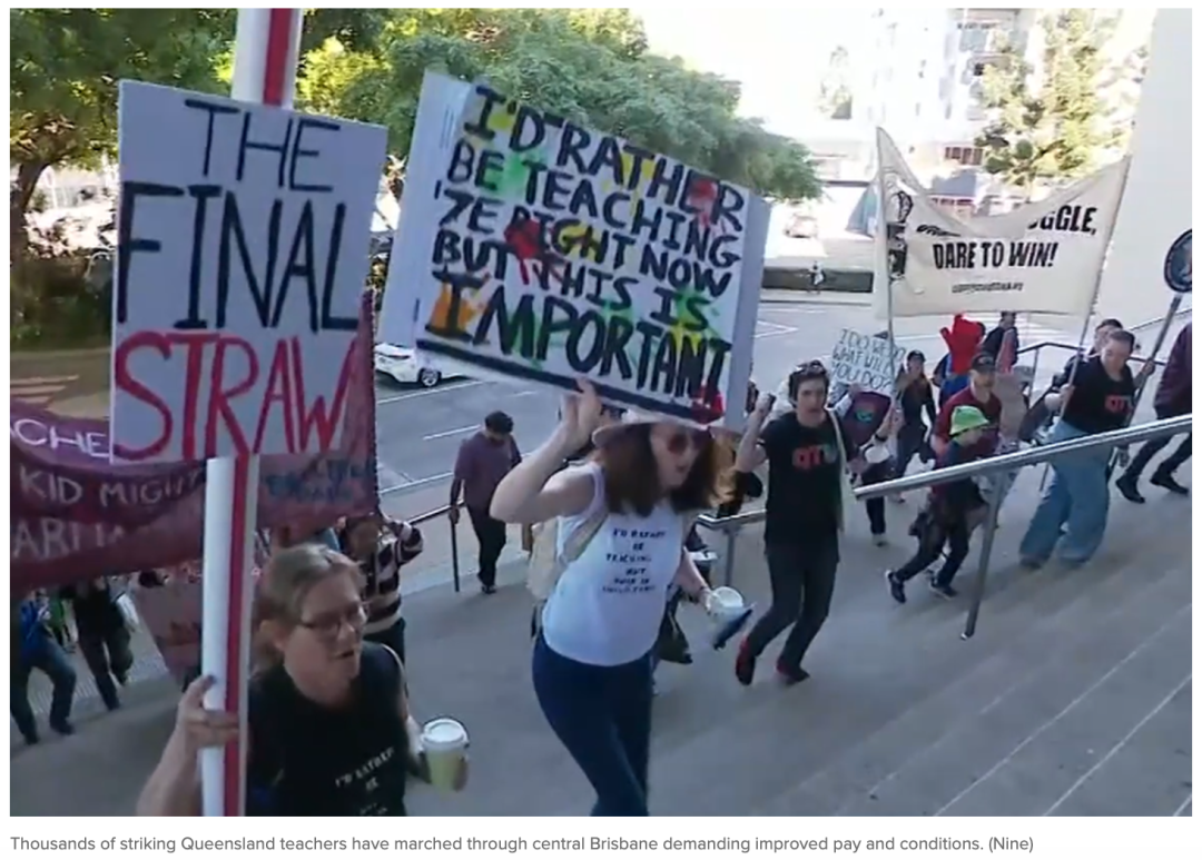 这是教师工会与州政府工资谈判中一次重大升级行动,昆州教师工会已经拒绝政府提出的三年内加薪8%的方案,并要求提升校园安全。