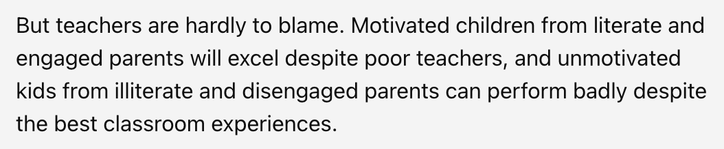 但责任不在教师,而在于孩子来自的家庭。如果父母积极参与孩子们的学习,这样的孩子即使遇到差老师,也能表现出色;