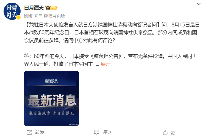 问:8月15日是日本战败80周年纪念日,日本首相石破茂向靖国神社供奉祭品,部分内阁成员和国会议员前往参拜,请问中方对此有何评论?