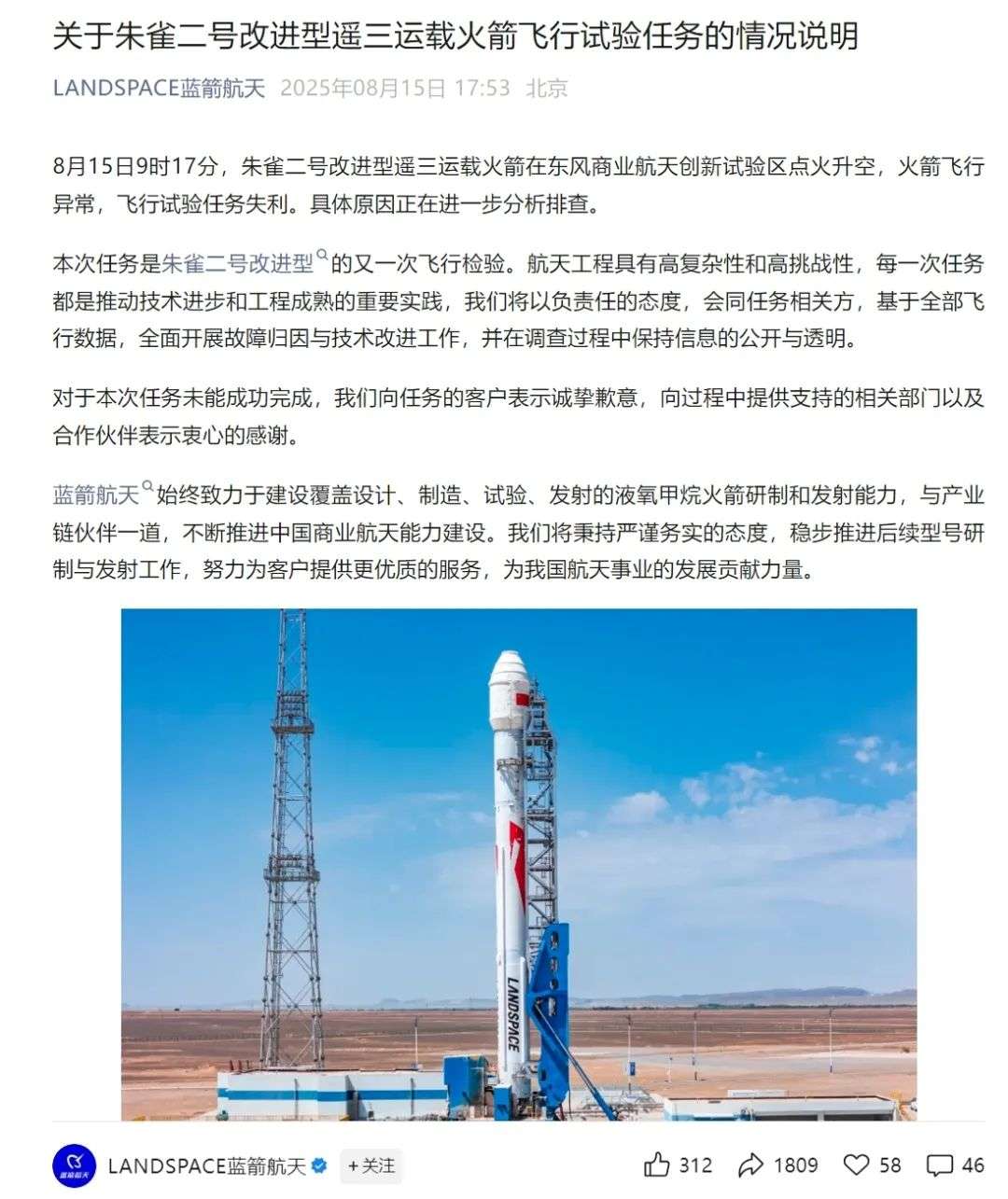 当天下午5点53分,蓝箭航天官方公众号发文称,上述飞行试验失利的具体原因正在进一步分析排查,并对此致歉。