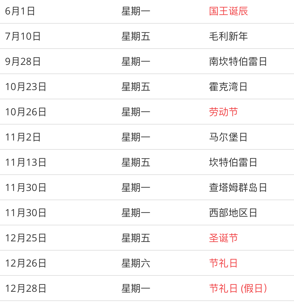 英国、荷兰:没有强制性的带薪公共假期(但英国法定有28天年假)。