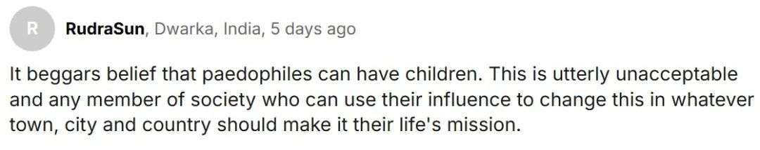 “简直令人难以置信,恋童癖居然还能有孩子。这完全无法接受,任何能利用自身影响力改变这一现状的人,无论身处哪个城镇或国家,都应将此视为毕生使命。”