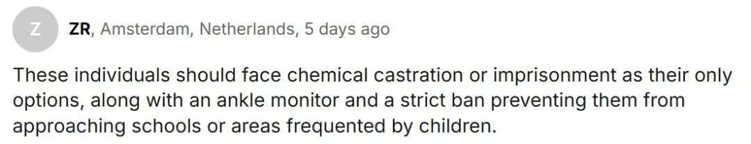 “这些人唯一的下场应该是接受化学阉割或监禁,同时戴上脚踝监控器,并被严格禁止接近学校或任何儿童经常出入的场所。”