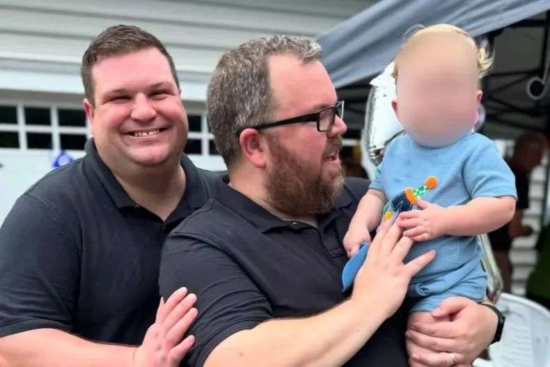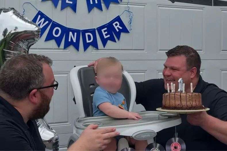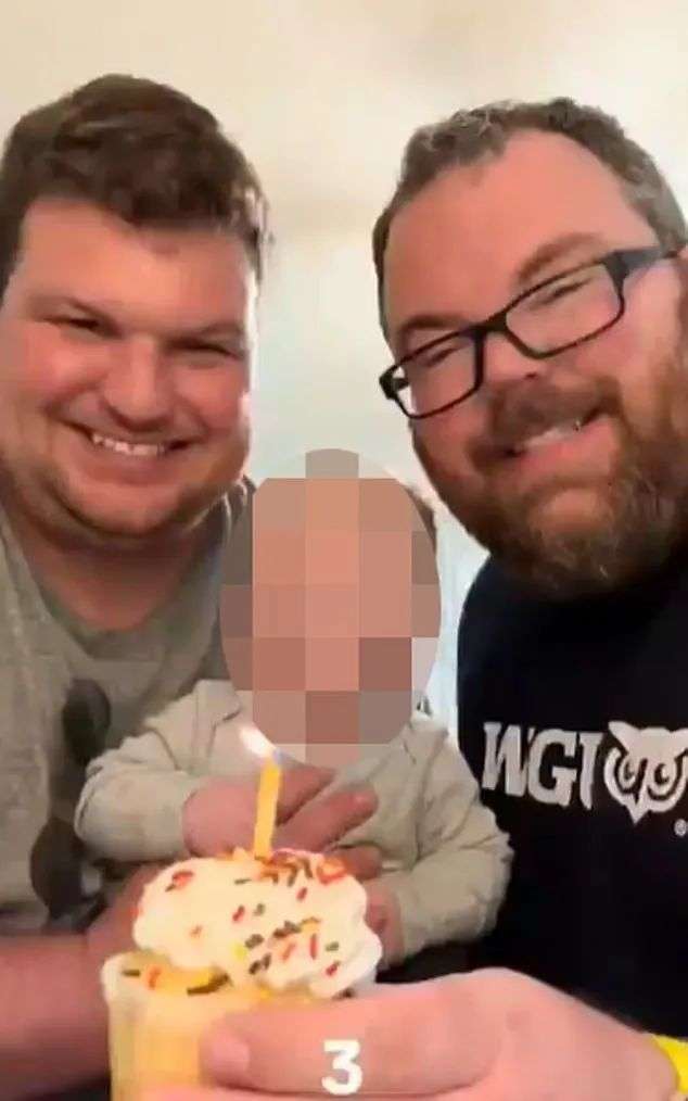 视频里,一对同性夫夫抱着他们的儿子,亲昵地亲吻他的额头,点燃蛋糕上的蜡烛,为他庆祝一周岁的生日。