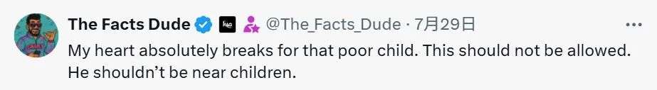 “我真为那个可怜的孩子感到心碎。这种事应该被禁止,他不应该接近任何儿童。”