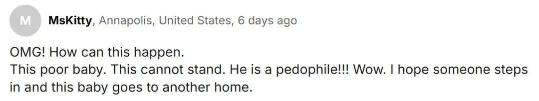 这番话毫无说服力,网友们于是又在线请愿,呼吁宾夕法尼亚州人类服务部、立法机构以及州长对情况展开调查,将孩子带走,并修订州法律,“堵住任何允许性犯罪者收养或获得儿童监护权的法律漏洞”。