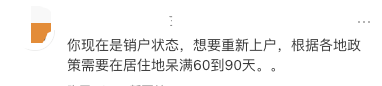你现在是销户状态,想要重新上户,根据各地政策需要在居住地呆满60到90天。。