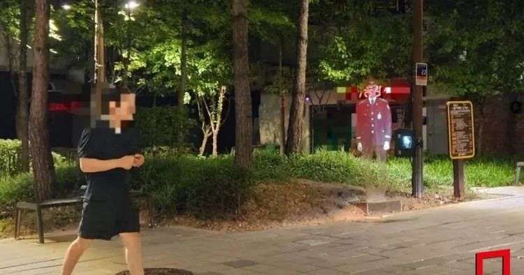 他们往首尔中区繁华地段的朱洞三号公园派了个警察,每天晚上7点之后,这位身高170厘米的警察就会在漆黑的公园里站岗。