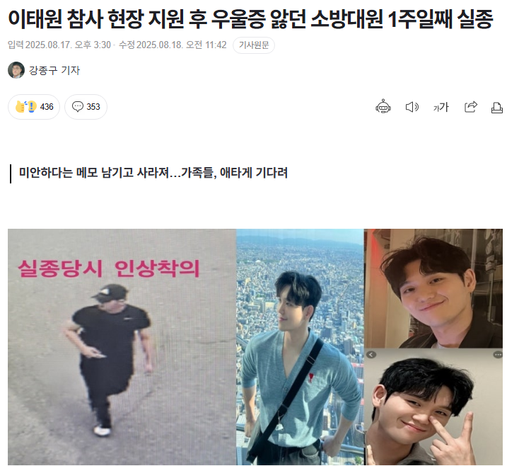 据悉,A某自2022年参与梨泰院踩踏事故救援后,被确诊抑郁症并持续接受治疗。他曾在媒体采访中坦言: