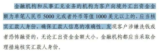 单笔人民币5000元(或等值1000美元)的境外汇款,必须核实汇款人身份。