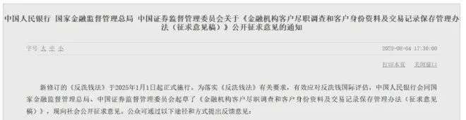 2025年8月4日,中国人民银行、国家金融监督管理总局、中国证券监督管理委员会联合发布了《金融机构客户尽职调查和客户身份资料及交易记录保存管理办法(征求意见稿)》。