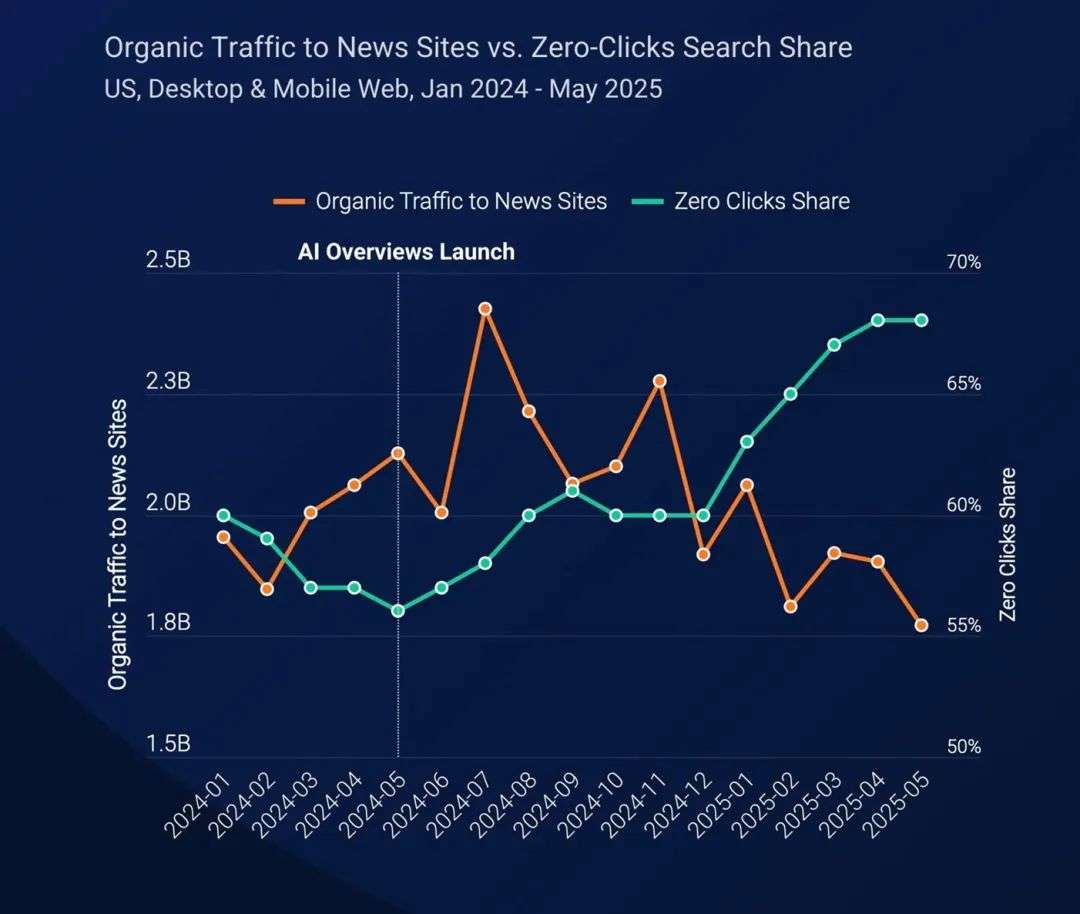 SimilarWeb的报告进一步证实,自谷歌2024年5月上线AI概览功能以来,网络新闻搜索中未能转化为新闻网站点击量的比例从56%上升至2025年5月的近69%。与此同时,全球新闻网站的自然流量也从2024年中期的超过23亿次访问量峰值降至2025年5月的不到17亿次。形成鲜明对比的是,ChatGPT中与新闻相关的提示词使用量却从2024年1月到2025年5月增长了212%。