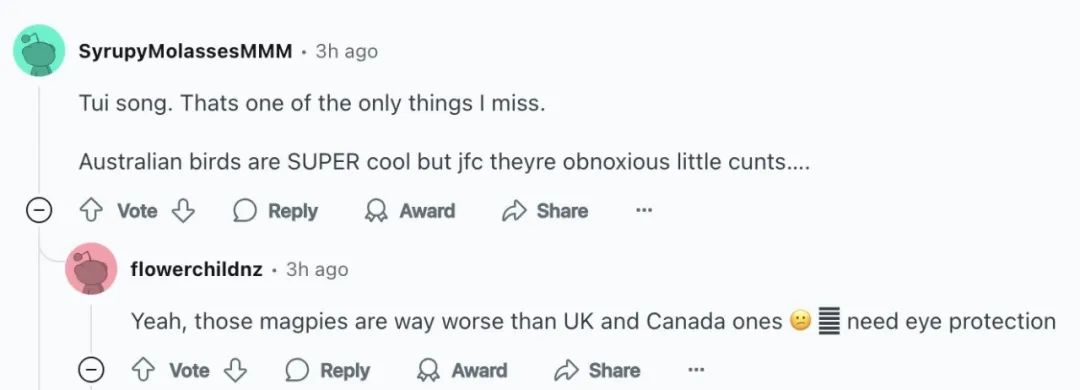 对此,也有不少网友表示赞同:“Tui的歌声。那是我唯一会想念的东西。澳洲的鸟类也超酷,但说实话,它们真的太吵了……”