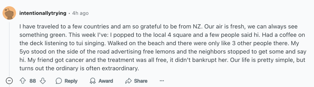 有网友如是说:“我去过一些国家,更加感激自己是新西兰人。”