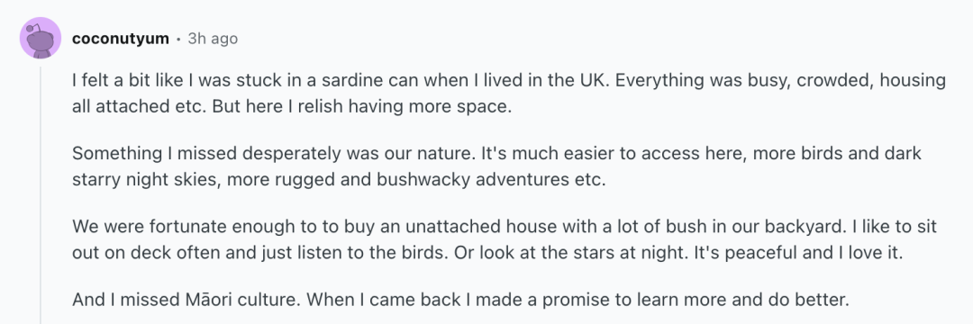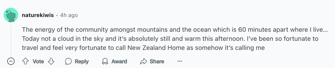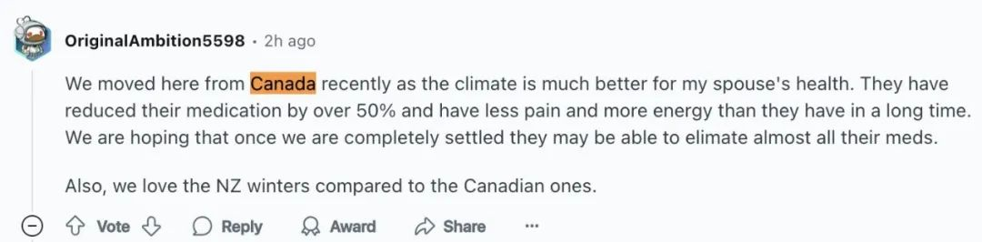 还有网友说:“我们是最近从加拿大搬过来的。新西兰的气候对我伴侣的健康有奇效,药量减少了一半以上,疼痛减轻,精力也比过去几年更充沛。”