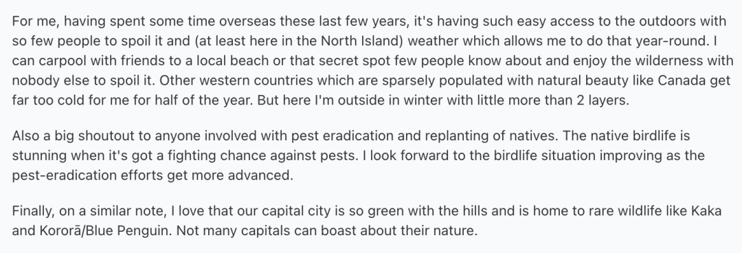 “另外,我也很喜欢我们的首都城市——它绿意盎然,群山环绕,还栖息着罕见的野生动物,比如卡卡鹦鹉(Kaka)和蓝企鹅(Kororā)。并不是很多国家的首都能这样自豪地谈论自然。”