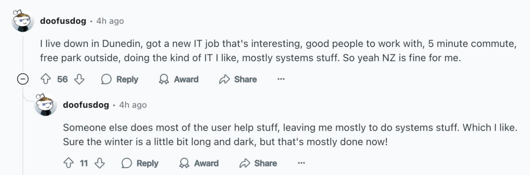 “我住在但尼丁,最近找到了一份有趣的IT工作,同事很好,通勤只要5分钟,还有免费停车位,主要做我喜欢的系统相关工作。”