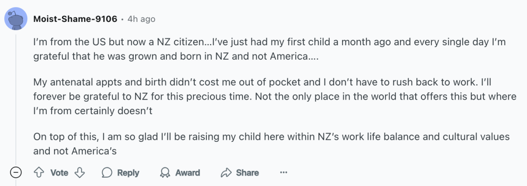 “虽然不是世界上唯一一个有这种制度的地方,但至少在我来自的国家,完全没有。此外,我很开心能在这里抚养孩子,享受新西兰的工作生活平衡和文化价值观,而不是美国那套。”