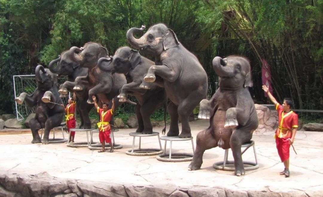 老板们会训练大象跳舞、骑摩托车、玩飞镖或者呼啦圈、走绳索或者吹口琴,这给大象带来了更多的痛苦。”