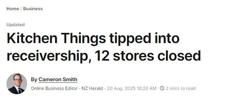 新西兰高端家电连锁店Kitchen Things进入破产管理,全国12家门店集体关闭。