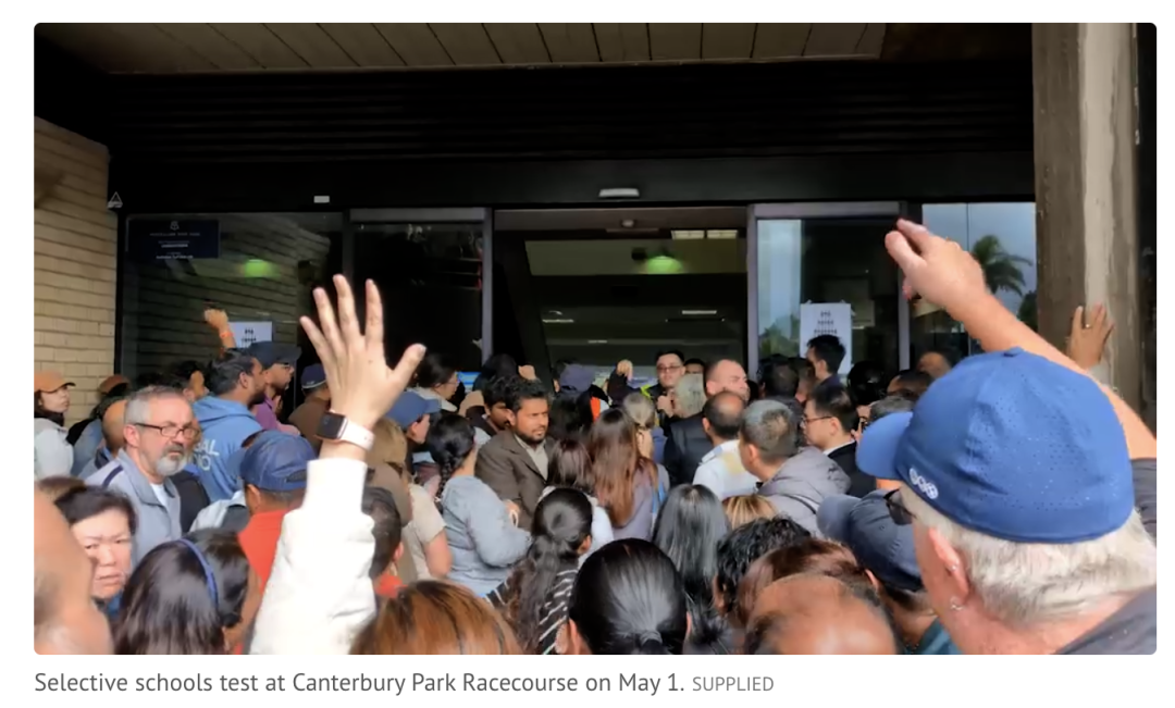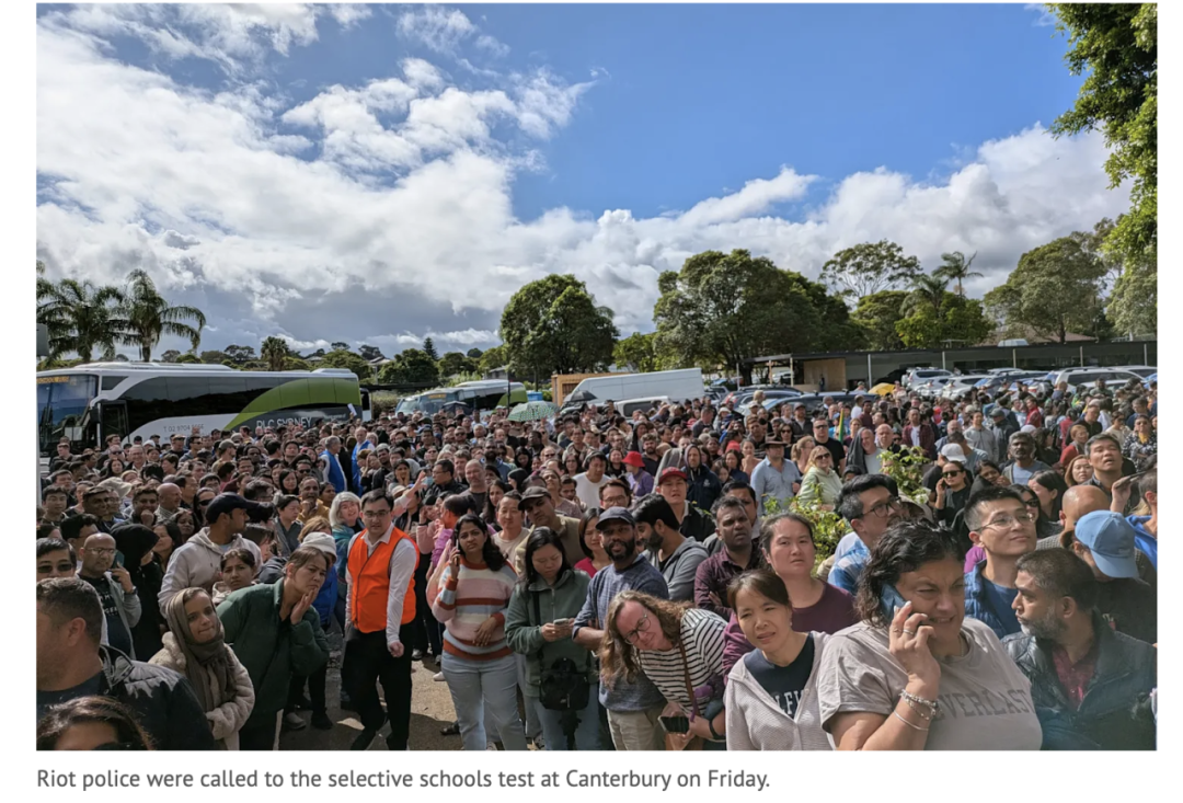 在 Canterbury 更一度出动了防暴警察。这不是演唱会现场,而是本应庄重的教育选拔考试。Randwick 的情况同样不堪,家长们在烈日下排起长队,等到进场时,考试早已延迟了近两小时。