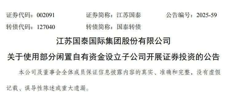 2023年8月25日,江苏国泰董事会审议通过议案,同意公司及合并报表范围内子公司使用闲置自有资金开展证券投资,投资总额不超过10亿元(含)。