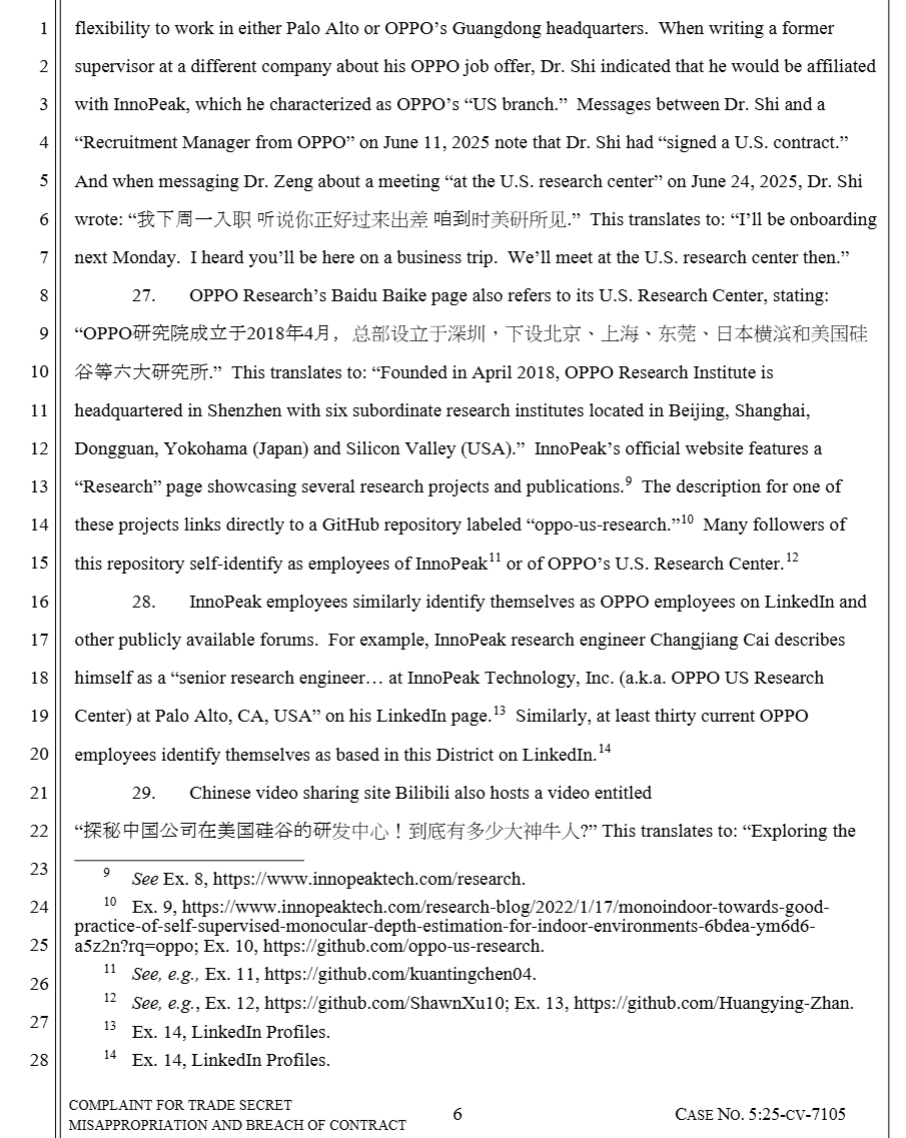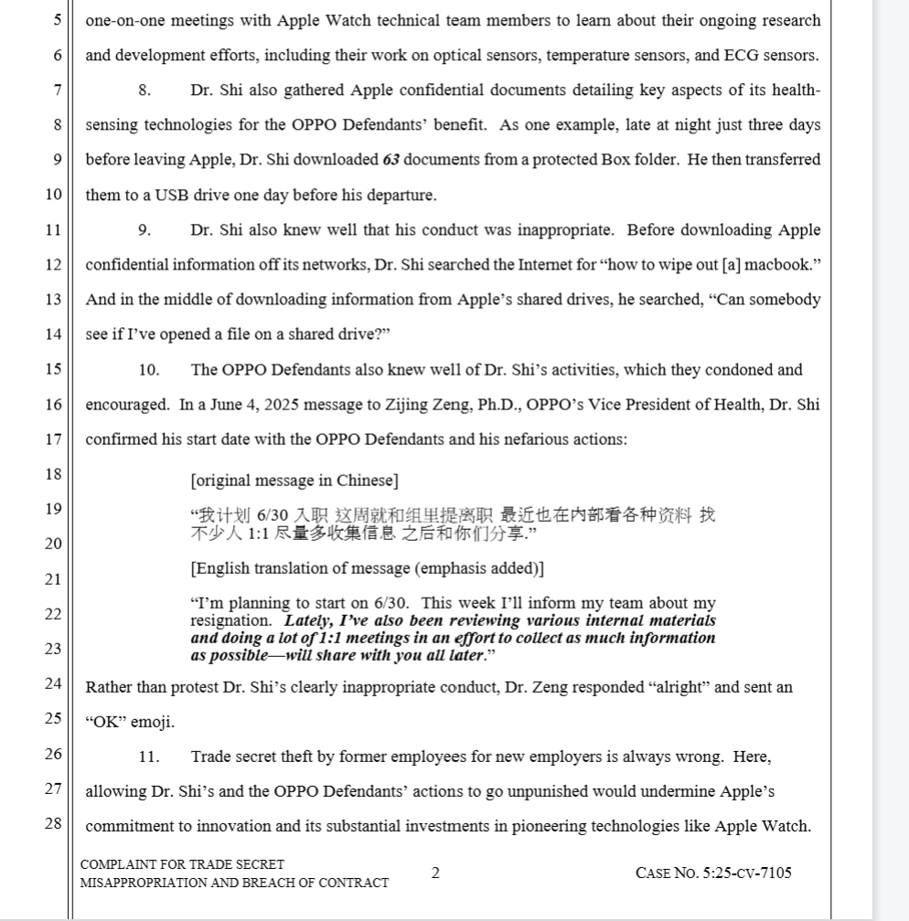不仅如此,苹果还指控陈实在离职前,故意隐瞒自己即将入职OPPO的事实。他在公司内部谎称“要回中国照顾年迈父母”,但实际上已接受OPPO位于硅谷研究中心的聘用。该中心以OPPO和InnoPeak两个品牌运营,专注于先进穿戴式设备的研发。
