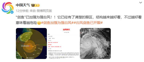 另据@中国天气 消息,台风“剑鱼”已开眼台风,加强为最强台风,有了清楚的眼区,结构越来越好看,不过越好看意味着越危险。