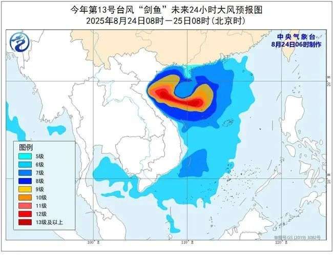 预计8月24日上午到25日上午,南海西北部、北部湾将出现5到8米的巨浪到狂浪区,海南东部、南部近岸海域将出现3到5.8米的大浪到巨浪。