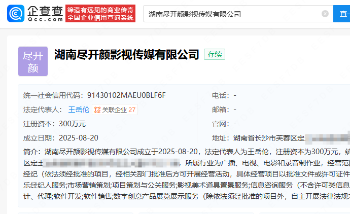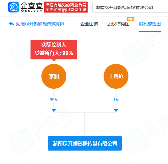 企查查APP显示,近日,湖南尽开颜影视传媒有限公司成立,注册资本300万元。在该公司中,李湘持有99%股权,王岳伦持有1%股权并担任法定代表人、执行公司事务的董事、经理职务。该合资公司的股权分配模式与之前如出一辙。
