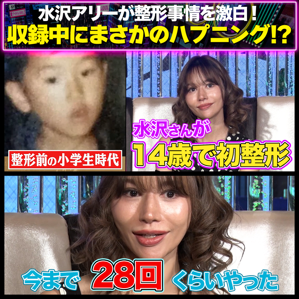 当时水沢在综艺节目《さんま&くりぃむの祝第15回芸能人一斉調査(秘)個人情報グランプリ》中被有田哲平、明石家さんま调侃:“水沢小姐,(整容)穿帮了吧?”当时她连连否认:“真的是自然成长啦!”“我没有的,绝对纯天然!”