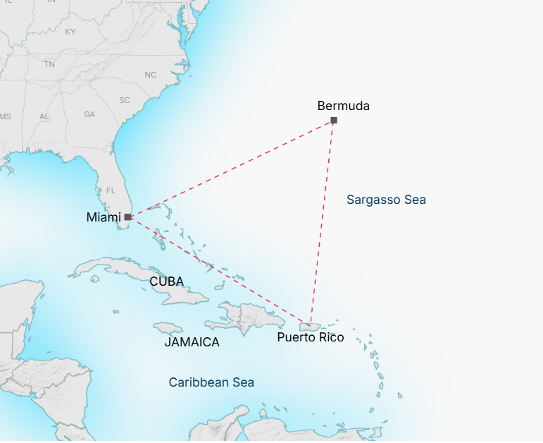 百慕大三角,位于大西洋的神秘水域,大致由美国迈阿密、百慕大和波多黎各三点连成。过去的百年间,这片海域因为接连不断的船只和飞机离奇失踪,而被冠以“魔鬼三角”的称号。