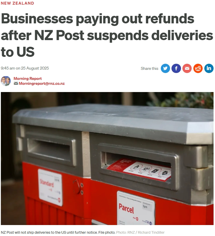 新西兰邮政已于8月21日起暂停向美寄送包裹。