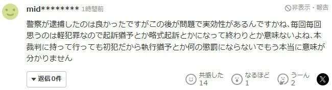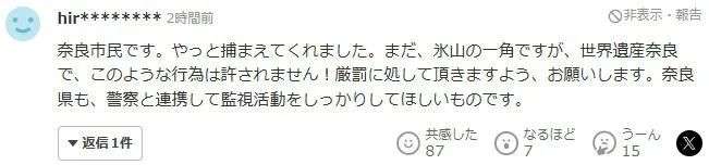 “我是奈良居民。偷拍者终于落网了。这只是冰山一角,但在奈良,这种行为是绝对不能容忍的!我希望他受到严惩。也希望奈良县能与警方密切合作,加强监控。”