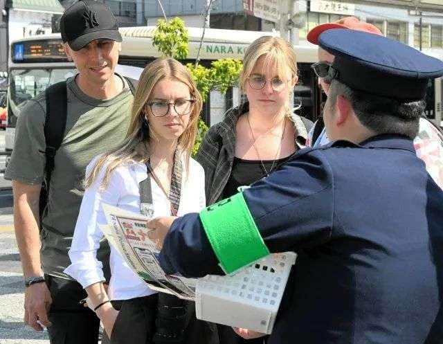 今年4月30日,奈良警察局长中田显一郎和警员们来到JR奈良站的东侧广场,在警车上用日语、英语、韩语和中文提醒民众: