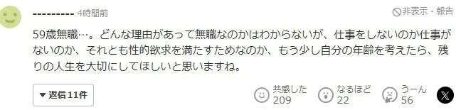 “59岁无业男子……我不知道他为什么是无业状态,不管是因为不想工作,还是没有工作,又或者是为了满足性欲,希望他能多想想自己的年龄,珍惜余生。”