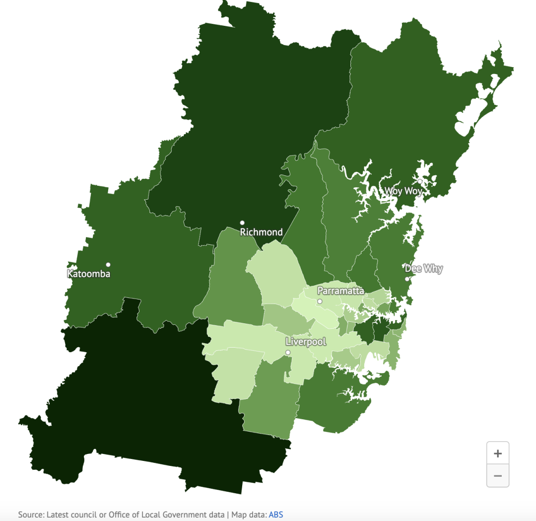 在 City of Sydney,每15岁以下的孩子就对应着两只狗;在 Woollahra 和 Inner West,比例是1.7只狗对一个孩子。