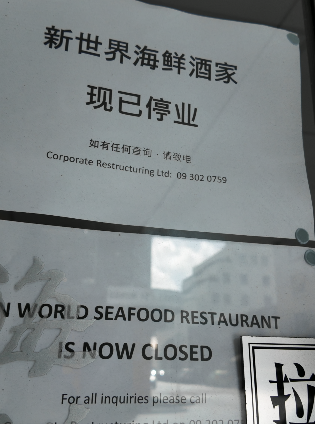 今天,有人发现奥克兰Newmarket的新世界海鲜酒家,门口贴了一张停业通知。