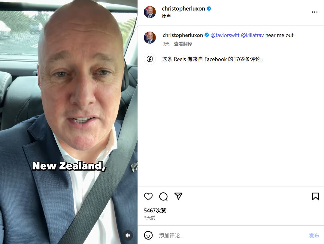 本周四,新西兰总理Christopher Luxon在社交媒体上发布视频,喊话泰勒和Travis。