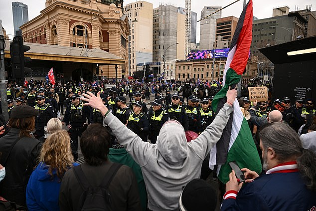 维州警方在Flinders St Station及周边设立路障,阻止双方直接接触,并有直升机进行空中监控。