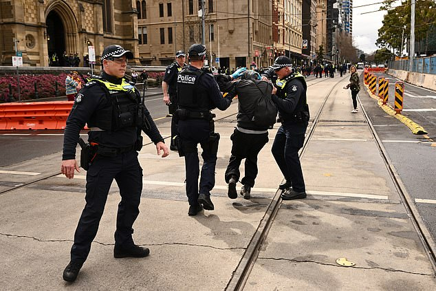 抗议过程中,部分示威者还对警察表达不满,有人提及本周Porepunkah枪击事件,指责警方当时未到场,而今天全力监控游行,场面一度陷入混乱之中。