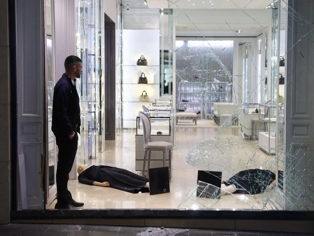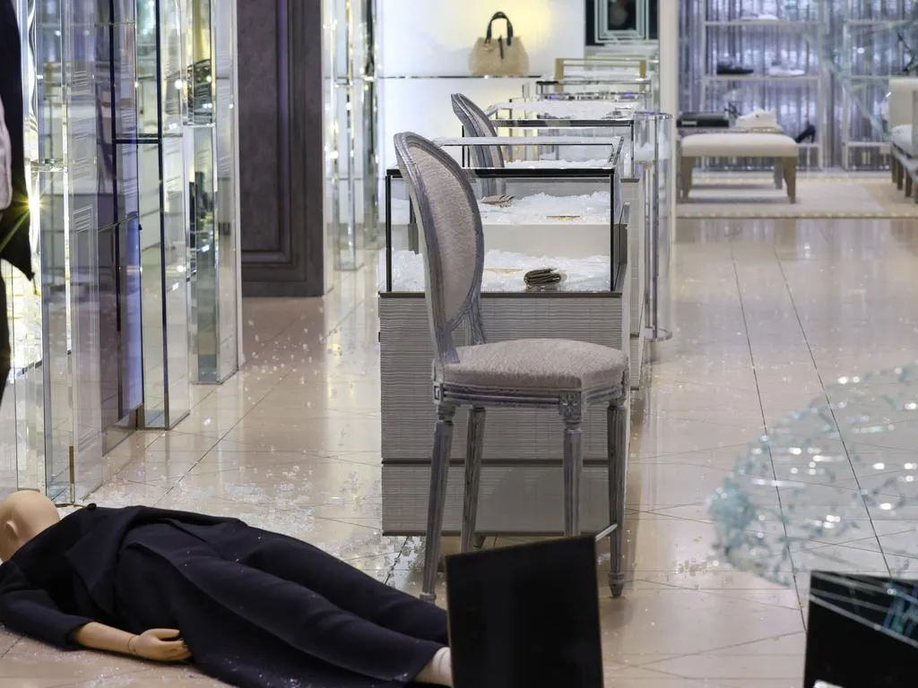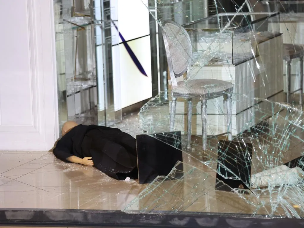 这次袭击造成了店内一片狼藉,模特和玻璃碎片散落一地。